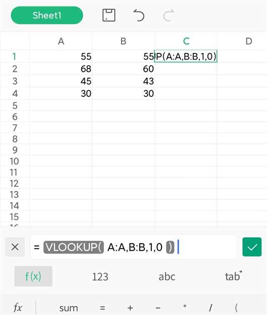 2.输入函数。首先在单元格内输入需要的函数:=VLOOKUP(A:A,B:B,1,0),再点击工具栏的绿√(已输入公式的单元格就会出现对比的结果:如果有重复数据就会显示数字,如果没有重复数据就会显示为#N/A)。