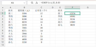 2.在删除重复项后的名称列旁边的空白单元格中输入公式“=SUMIF(A:A,E2,B:B)”,输入完成后按下【Enter】键,就能得到该人名对应的汇总求和数据。这个公式中,【A:A】代表原表中名称列的区域,【E2】是删除重复值列中第一个名称所在的单元格,【B:B】则是原表中需要求和的数据列区域。