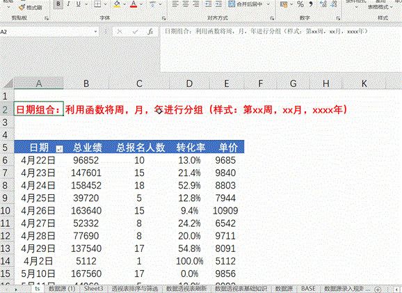 最佳答案(一)日期组合示例利用函数将周,月,年进行分组(样式:第xx周,xx月,xxxx年)公式:周数=”第”&WEEKNUM(A2,2)&”周”月份=MONTH(A2)&”月”年份=YEAR(A2)&&......