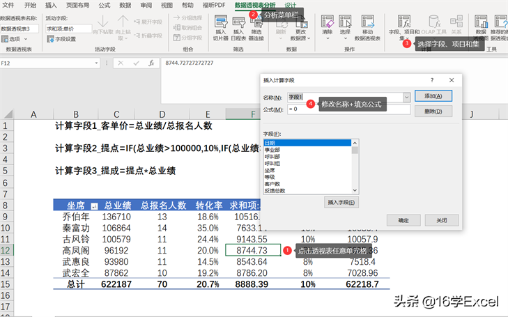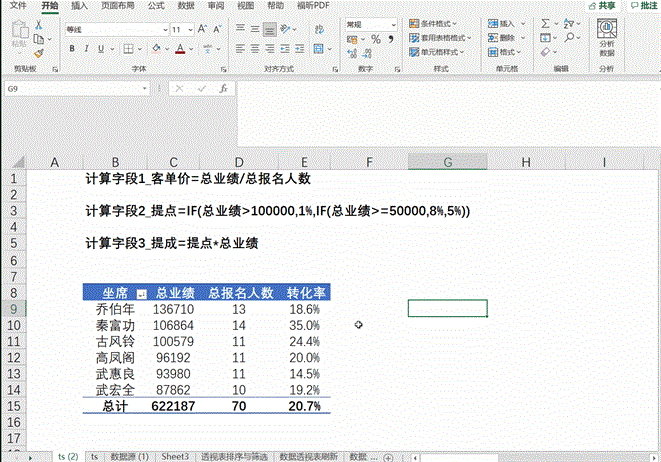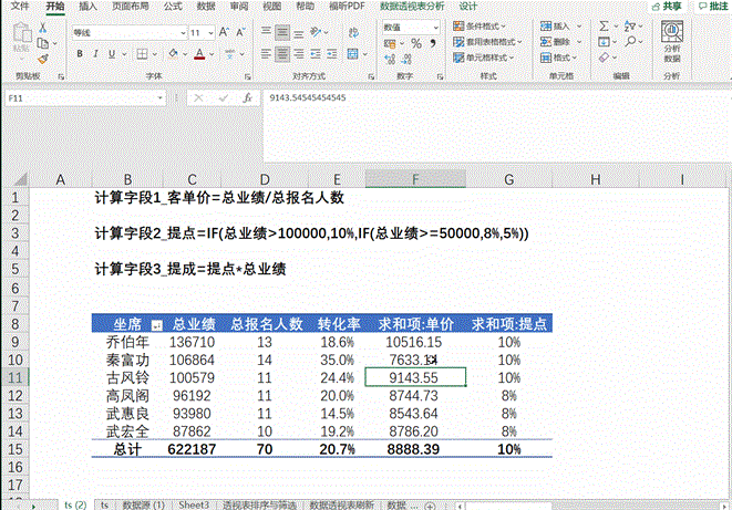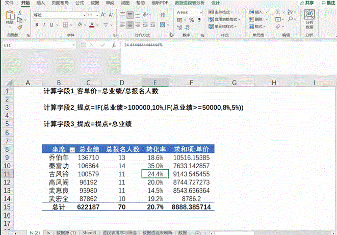最佳答案添加步骤如下:添加数据字段步骤1.使用计算字段计算单价:【客单价=业绩/报名人数】透视表计算字段2.在计算字段使用Excel函数进行计算:根据业绩分层设置提点【5万以下5%,5-10万提点8%,10万以上提点10%】计算字段使用Excel函数备注:公式输出结果必须为数值否则出现错误3.使用新建计算字......