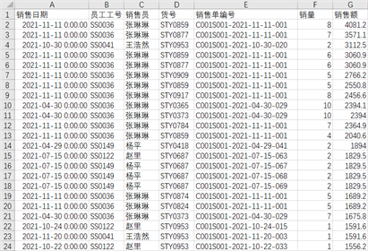 这里有一份2021年1月到12月全年的各个销售员的销售量和销售额明细,那么如何根据这一份销售明细,汇总每一个销售员的销量和销售额呢?样例数据如下。