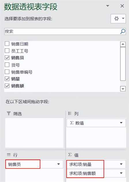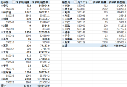 如果我们想看各个销售的销量和销售额情况,并且销售员后面需要匹配各个销售员的工号,那么在行里面同时拖入销售员和员工工号。