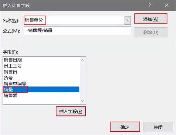 插入计算字段,自定义一个名称为销售单价,写入公式:=销售额/销量,其中销售额和销量都需要插入字段,点击添加完成计算字段,点击确定即可生成。