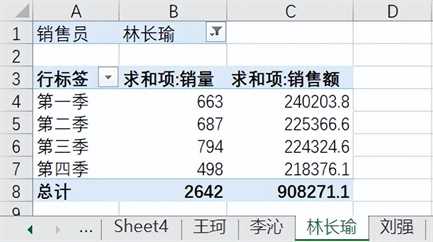 如下得到了每一个销售员每一个季度的销量和销售额情况,具体明细分发到了每一个单独的Sheet表中。