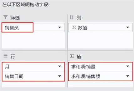 第三步、在数据透视表字段中,将销售员拖入到行,将销量和销售额拖入到值进行汇总,即可得到汇总结果。