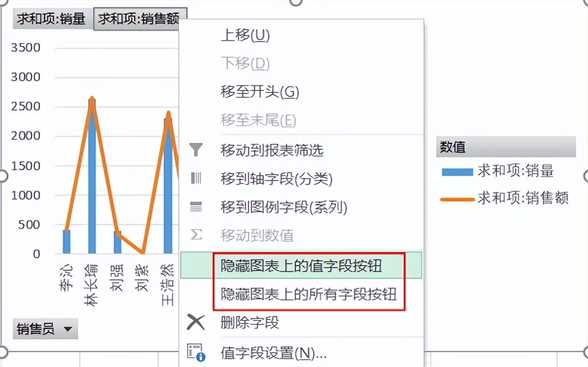 创建图形后,发现图表有很多字段按钮,这里可以右键点击隐藏图表上的值字段按钮、隐藏图表上的所有字段按钮。