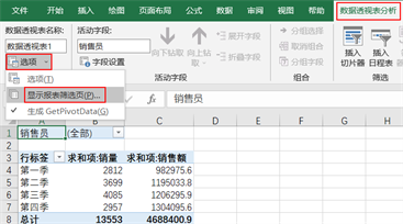 上面得到所有销售员手动分组后每一个季度的销量和销售额,若需要得到每一个销售员的具体明细,我们选择数据透视表,在数据透视表分析选项卡下选项点击显示报表筛选页。
