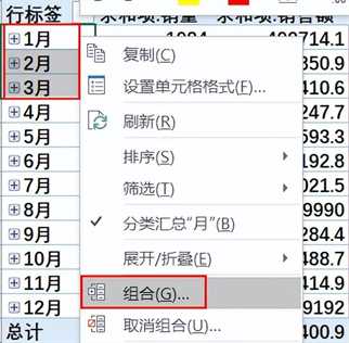 如果我们要将按月排列改为按季度,可以选择要手动分组的区域,右键点击组合。
