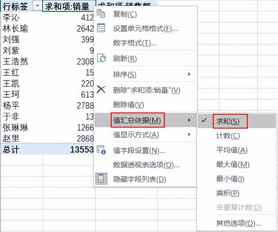默认对于数据字段是无计算的,如果要计算每一个销售员销量占总销量百分比情况,可以右键,在值显示方式中选择总计百分比,即可得到汇总的结果。
