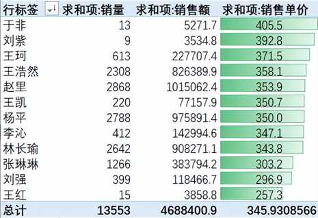 同时,可以对销售单价降序排列,并且使用条件格式中的数据条功能,可以直观的看出于非的销售单价最高,王红的销售单价最低。