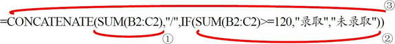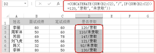 =CONCATENATE(SUM(B2:C2),”/”,IF(SUM(B2:C2)>=120,”录取”,”未录取”))