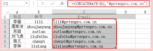 =CONCATENATE(B2,”prtenpro.com.cn”)