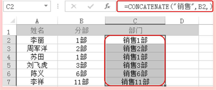 表格的B列单元格区域中显示的是销售员所在分部,现在需要一次性在所有分部名称前加上“销售”二字,此时可以使用CONCATENATE函数来建立公式。
