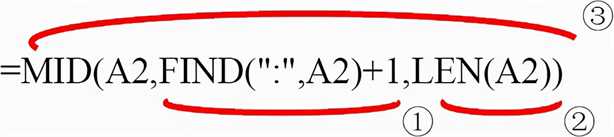 ①使用FIND函数返回“:”号在A2单元格中的位置,加1表示提取的起始位置。