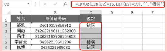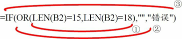 =IF(OR(LEN(B2)=15,LEN(B2)=18),””,”错误”)