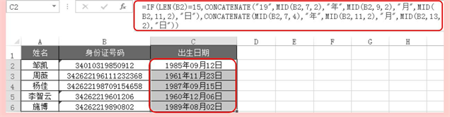 =IF(LEN(B2)=15,CONCATENATE(“19″,MID(B2,7,2),”年”,MID(B2, 9,2),”月”,MID(B2,11,2),”按“Enter”键即可从身份证号码中提取员工“邹凯”的出生日期。