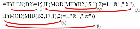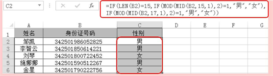 =IF(LEN(B2)=15,IF(MOD(MID(B2,15,1),2)=1,”男”,”女”),IF (MOD(MID(B2,17,1),按“Enter”键即可从身份证号码中获取第一位员工的性别信息。