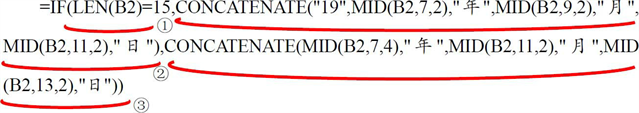 ②如果步骤①条件满足,分3次从B2单元格字符串中提取字符,分别是:第7、8位(年份);第9、10位(月份);第11、12位(日)。再使用CONCATENATE函数将提取的字符