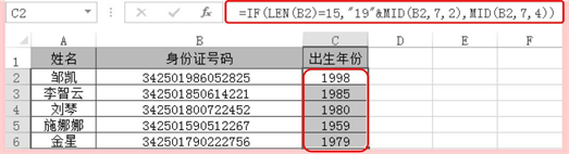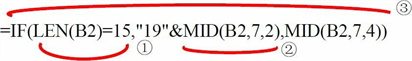 =IF(LEN(B2)=15,”19″&MID(B2,7,2),MID(B2,7,4))
