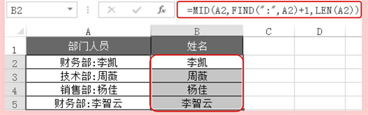 A列为公司部门人员名单,每个单元格中同时包含了部门和员工姓名,并且之间以冒号分割。使用MID函数配合FIND函数可以提取出员工姓名并显示在B列中。