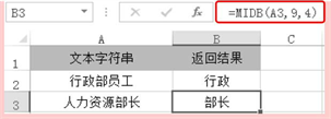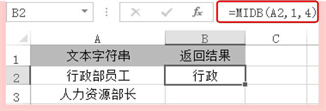 因为一个文字等于两个字符,“=MIDB(A2,1,4)”的意义是从第一个字节开始提取,共提取4个字节,因此提取的是“行政”两个字。