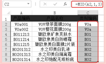 产品编号中包含产品的类别编码和序号,使用MID函数可以将类别编码分离出来。