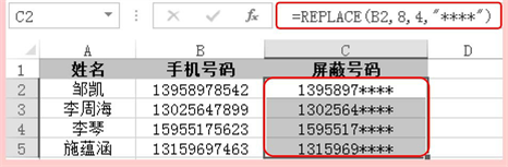 使用REPLACE函数可以实现屏蔽重要号码的后几位数,将其设置以“*”显示,以达到保护客户隐私的目的。