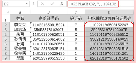 在2000年以前的身份证号码为15位,使用REPLACE函数可以把15位身份证号码从第7位开始把字符替换为“19”,然后运用连接运算符把验证码连接起来,完成18位身份证号码的升级设置。