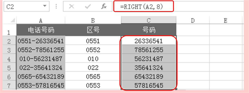 当前数据表的A列中,电话号码的位数都为8位(区号为3位或4位),可以首先使用LEN、LEFT函数提取出电话号码的区号,然后再利用RIGHT函数提取出区号右侧的具体号码。