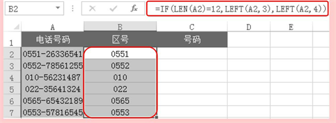 ➋ 将光标移到B2单元格的右下角,待光标变成十字形状后,按住鼠标左键向下拖动进行公式填充,即可快速提取其他电话号码中的区号,如图1所示。