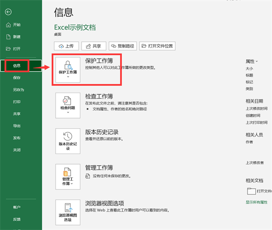 2、单击【文件】后,,找到【信息】选项,并单击它,找到【信息】选项页面的【保护工作簿】选项,如下图所示。