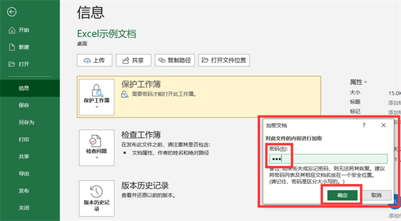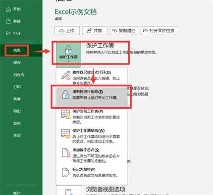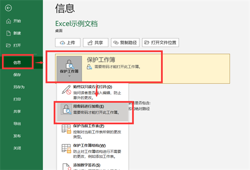 还是单击【文件】,找到【信息】选项下的【保护工作簿】,再往下找到【用密码加密】选项,如下图所示。