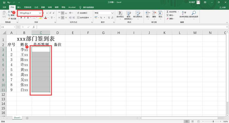 5.选中需要填入符号的单元格,选择字体【Wingdings 2】。