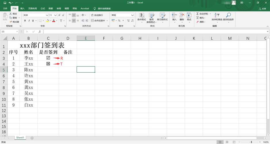 6.在设置好的单元格中输入大写【R】即可快速填入带方框的打勾符号,输入大写【T】则输入带方框的交叉符号。