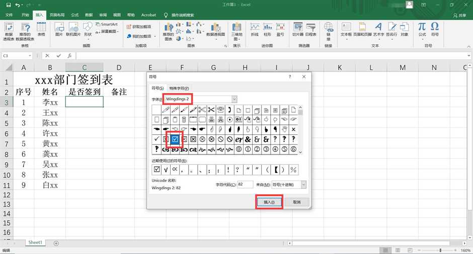 最佳答案操作步骤:1.打开一份Excel签到表。2. 点击【插入】选项,选择【符号】。3.选择【字体】中的【Wingdings 2】即可看到带方框的打勾符号,点击插入即可。4.你可以任意复制粘贴填入,如果你觉得有些麻烦,可以接着往下看。5.选中需要填入符号的单元格,选择字体【Wingdings 2】。6.在......