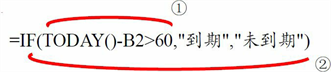 =IF(TODAY()-B2>60,”到期”,”未到期”)