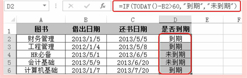 表格统计了图书的借出日期和还书日期,本例规定:借阅时间超过60天时,即显示“到期”,否则显示“未到期”。