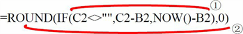 =ROUND(IF(C2<>””,C2-B2,NOW()-B2),0)