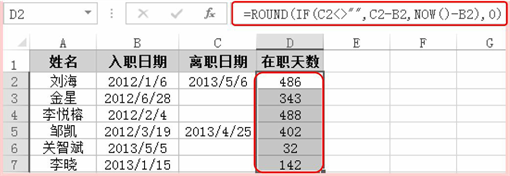 表格显示了员工的入职日期和离职日期,使用NOW函数和ROUND函数可以统计出每名员工的在职天数。