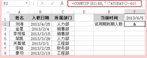 本例规定了员工的试用期为60天,根据表格中的入职日期和当前时间间,可以利用TODAY函数结合COUNTIF函数统计试用期到期的人数合计值。