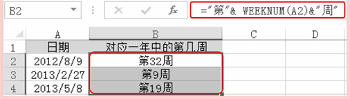 ①将A2:A11单元格区域中的日期转换为日期序列号数组,然后WEEKNUM函数算出A列所有日期属于该年度的第几周。