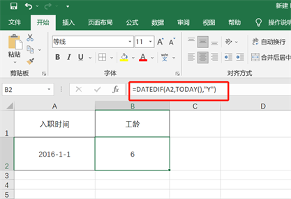 如下图,要计算员工的工龄,A2表示入职时间,TODAY()函数表示今天,Y表示以年的方式统计,DATEDIF函数就计算出两个日期相隔多少年数。