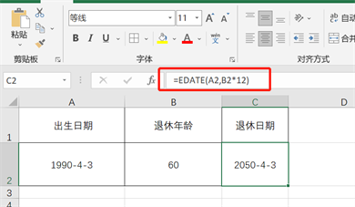 如下图,A2表示出生日期,B2*12表示退休年龄乘以12个月,即出生多少月可以退休,函数EDATE就可以得到退休的日期。