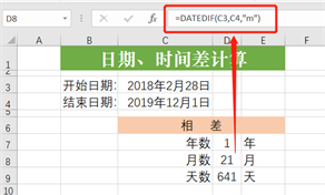 2、计算日期月份之差:在D8单元格输入公式:=DATEDIF(C3,C4,”m”),其中”m”表示计算两个日期月份差。