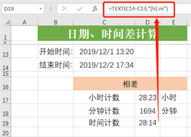 3、以小时:分钟显示:如下图,在D19单元格输入公式:=TEXT(C14-C13,”[h]:m”),得出计算结果是两个日期之间相差28小时14分钟。