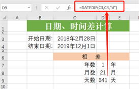 2021/1/1 | 2021/12/2 | “d” | =DATEDIF(A4,B4,”d”) | 335 | “d”表示计算相差天数 | ||