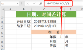 1、计算日期年份之差:如下图,在D7单元格输入公式:=DATEDIF(C3,C4,”y”),其中”y”表示计算两个日期年份差。