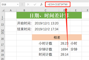 (2)以相差多少个分钟表示:如下图,在D18单元格输入公式:=(C14-C13)*24*60,得出计算结果是两个日期之间相差1694分钟。