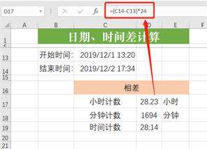 (1)以相差多少个小时表示:如下图,在D17单元格输入公式:=(C14-C13)*24,得出计算结果是两个日期之间相差28.23小时。