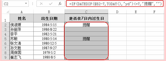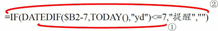 =IF(DATEDIF($B2-7,TODAY(),”yd”)<=7,”提醒”,””)